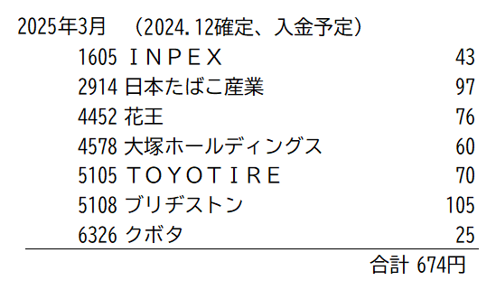配当金って、銘柄によって確定日が決まっています。私が持っている銘柄は【3月/9月確定グループ】と【6月/12月確定グループ】があるみたい。次は3月に674円入金される予定。