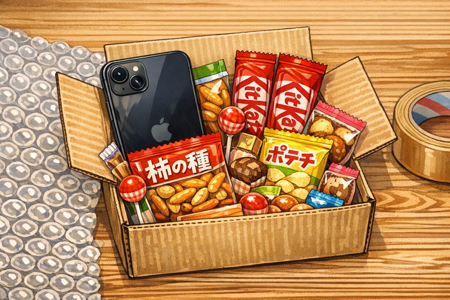 それでいったんわが家で受け取って箱のすき間にお菓子をいっぱい詰めて送り返してやった。